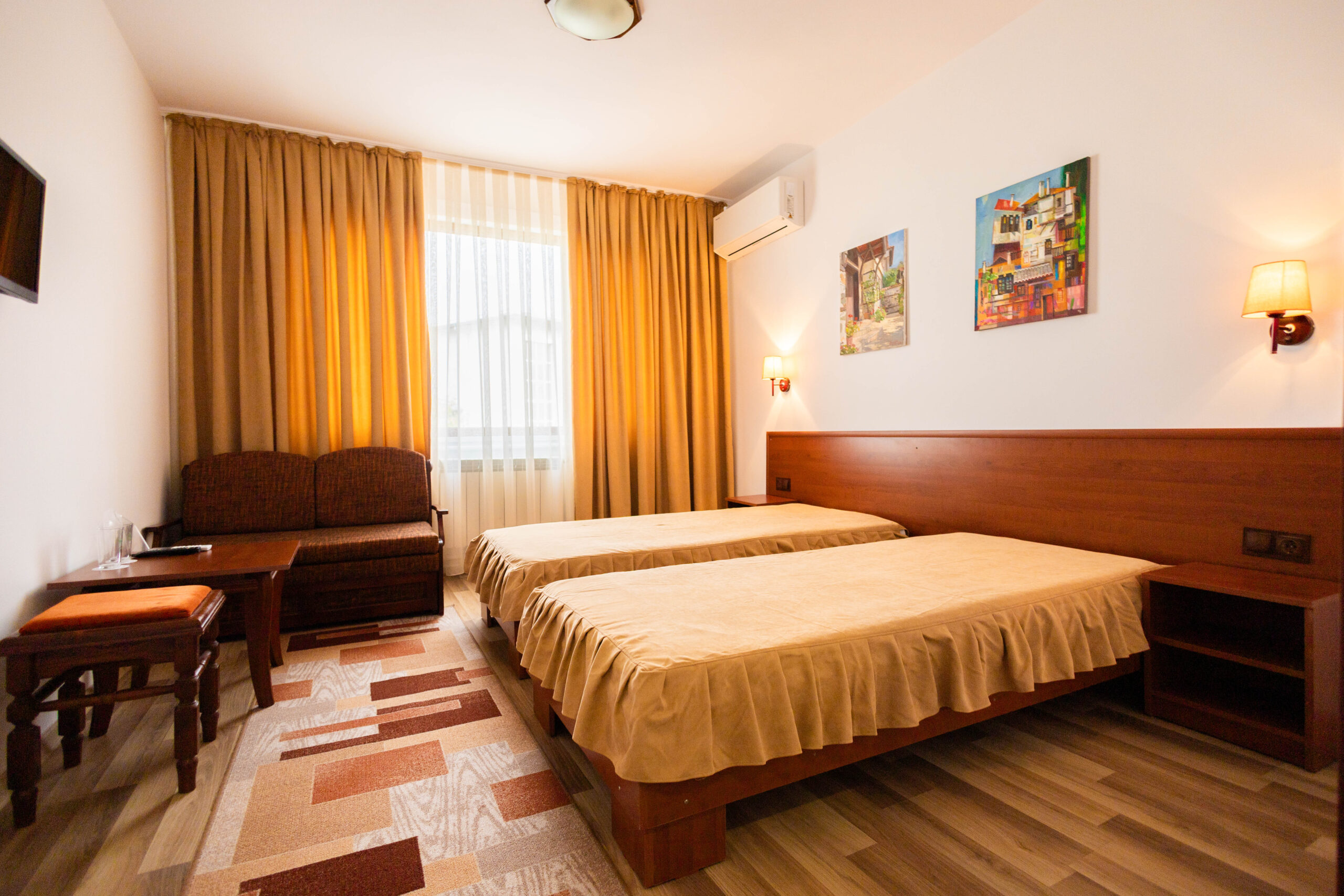 Хотелът разполага с общо 56 редовни легла, разпределени в 20 двойни и тройни стаи, всяка със собствен санитарен възел, налични хотелски консумативи, хавлии, телевизор и климатик. На първия етаж на хотела се намира ресторант „Авеню“ с капацитет от 70 места— стилно и уютно място за закуска, обяд и вечеря. В него по предварителна заявка се извършва изхранването на настанените групи.